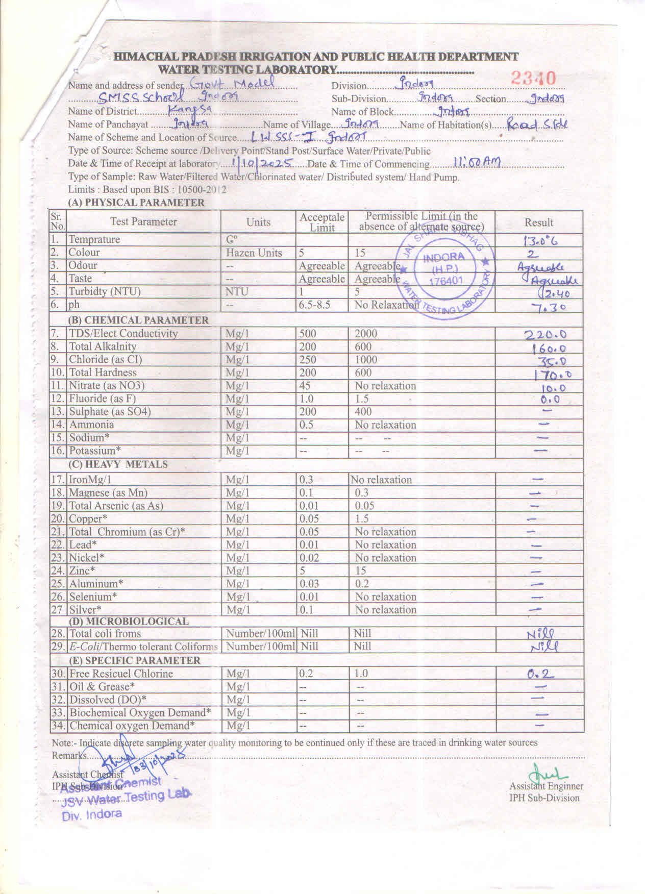 Click HereWater sample test report from Public Health Engineer Department